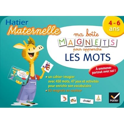 L'apprentissage d'un vocabulaire varié dès 4 ans grâce à la manipulation de 83 magnets à aimanter directement sur une boîte magnétique qui contient également un cahier-imagier avec 450 mots, 47 jeux et activités pour enrichir son vocabulaire.Boîte=32 pages. Editeur =Hatier (26 juin 2013). Collection =Hatier maternelle. Langue =Français. ISBN-10=2218963620. ISBN-13=978-2218963629. Dimensions du produit=23 x 2 x 17 cm. Moyenne des commentaires client =Soyez la première personne à écrire un commentaire sur cet article. Classement des meilleures ventes d'AmazonSupports pédagogiquesMaternelleFormation, école, société=298.814 en Livres (Voir les 100 premiers en Livres) .zg_hrsr { margin: 0; padding: 0; list-style-type: none; } .zg_hrsr_item { margin: 0 0 0 10px; } .zg_hrsr_rank { display: inline-block; width: 80px; text-align: right; } n°799 dans Livres > Scolaire et Parascolaire > Pédagogie et enseignement > n°1458 dans Livres > Scolaire et Parascolaire > n°2328 dans Livres > Etudes supérieures > Pédagogie et orientation > Pédagogie et éducation >.