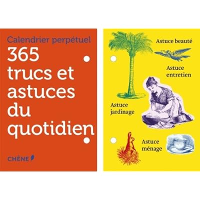 Dans ce calendrier perpétuel pratique et esthétique, retrouvez des astuces pour répondre à tous les petits tracas du quotidien. Une tache difficile à enlever ? Des pucerons sur les plantes ? Un masque de beauté pour le visage ? Toutes les recettes indispensables sont dans ce calendrier. Une page par jour avec un large espace pour noter ses rendez-vous, les occasions à ne pas oublier ou l’anniversaire de ses proches.Belle reliure=365 pages. Editeur =Editions du Chêne (14 septembre 2011). Collection =Calendrier perpétuel. Langue =Français. ISBN-10=2812304979. ISBN-13=978-2812304972. Dimensions du produit=23,5 x 4,5 x 16,2 cm. Moyenne des commentaires client =Soyez la première personne à écrire un commentaire sur cet article. Classement des meilleures ventes d'AmazonÉphémérides=912.184 en Livres (Voir les 100 premiers en Livres) .zg_hrsr { margin: 0; padding: 0; list-style-type: none; } .zg_hrsr_item { margin: 0 0 0 10px; } .zg_hrsr_rank { display: inline-block; width: 80px; text-align: right; } n°132 dans Livres > Calendriers et Agendas >.